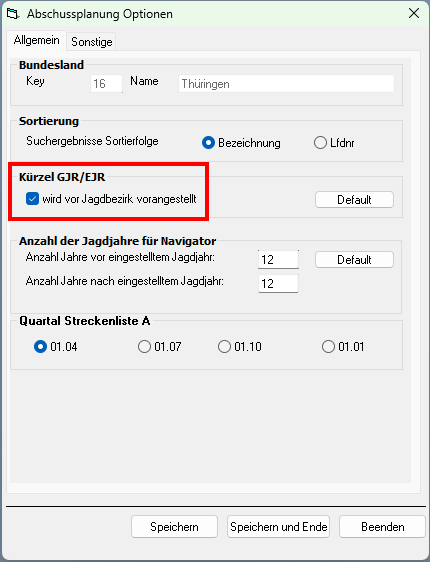 - Die Jagdbezirksart (EJB / GJB) kann nun wieder für den Quickfinder hinzugefügt werden. Hierzu klicken Sie auf den Menüpunkt „Abschussplanoptionen".