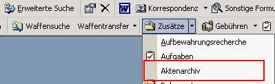 Um in die Übersichtsmaske des Aktenarchivs zu gelangen, navigieren Sie in der oberen Menüleiste auf die Schaltfläche [Zusätze]. Aktivieren Sie das Untermenü, indem Sie mit der linken Maustaste auf den rechts neben der Schaltfläche befindlichen schwarzen Pfeil klicken. Wählen Sie hier die Option „Aktenarchiv" aus.