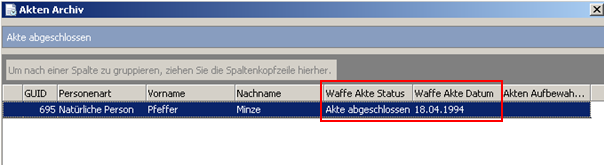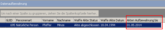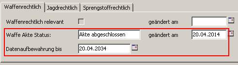 Mit Hilfe des Feldes „Datenaufbewahrungs bis" können Sie eigenständig festlegen, zu welchem Zeitpunkt eine Personenakte mit allen verknüpften Erlaubnis- und Waffendaten aus Ihrem Datenbestand zu entfernen ist. Das Datumsfeld sollte in einem Schritt mit der Archivierung einer Personenakte in der Condition Waffenverwaltung gepflegt werden. Die Vergabe eines Datum im Zeitraum (20 Jahre oder mehr) erfolgt nicht automatisch und ist fallbezogen zu bestimmen.