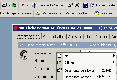 Um einen Personendatensatz zu löschen, öffnen Sie zunächst die Ansichtsmaske der Person, klicken Sie mit der rechten Maustaste in die Bildschirmmaske und wählen Sie die Option „Datensatz löschen". Alternativ können Sie den Datensatz über die obere Menüleiste „Bearbeiten -> Datensatz löschen" aus ihrem Datenbestand entfernen.